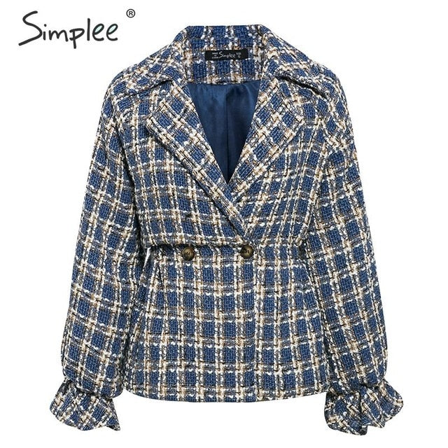 Simplee Elegant women plaid tweed jacket coat Lantern sleeve streetwear female outwear coat Elastic high waist ladies coat